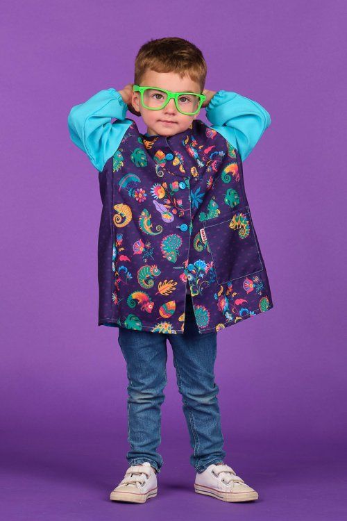 Babi infantil de manga larga con puños de goma. Cierre central con botones y cuello redondo. Tiene cinta en el cuello para colgar y un bolsillo en el lateral. Divertido estampado de camaleones sobre fondo morado y azul turquesa. Tejido muy suave y transpirable. Tolerante a las salpicaduras de lejía. Seca muy rápido y no necesita planchado.