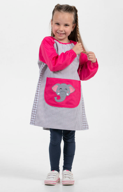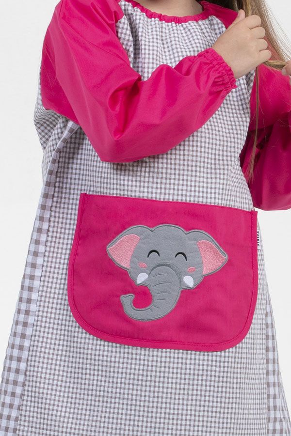 Babi infantil de manga larga con puños de goma. Con cuello elástico y cinta para colgar. Tiene un amplio bolsillo central con bonito estampado de elefante bordado. Fondo de cuadros gris con mangas a contraste en color fucsia. Tejido de alta calidad, resistente y duradero. Seca muy rápido y no necesita planchado.
