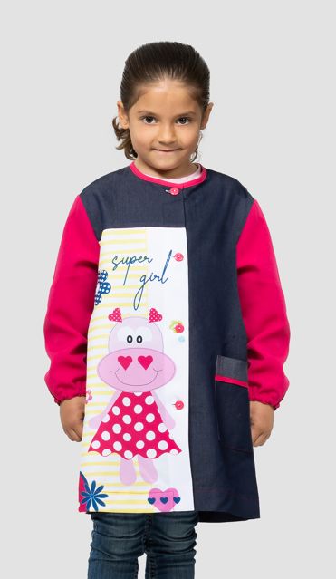 Babi infantil de manga larga con puños de goma. Cierre central con botones. Tiene cinta en el cuello para colgar y un bolsillo lateral. Divertido estampado de hipopótamo en el lateral con la frase "Super Girl". Mangas fucsia a juego con los botones sobre fondo azul tejano. Tejido muy suave y duradero. Seca muy rápido y no necesita planchado.