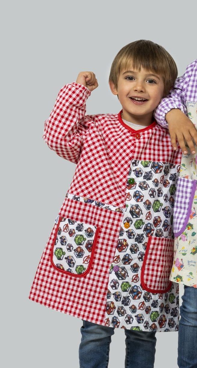 Babi infantil de manga larga con puños de goma. Cierre central con botones de diferentes colores. Tiene cinta en el cuello para colgar y dos bolsillos laterales. Estampado lateral de super héores sobre fondo de cuadro rojo. Tejido muy suave y resistente. Seca muy rápido y no necesita planchado.