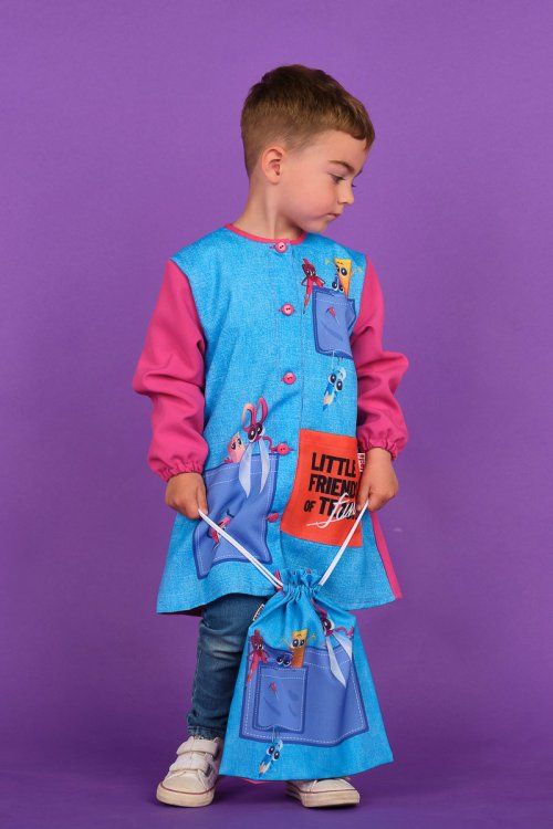 Babi infantil de manga larga con puños de goma. Cierre central con botones. Tiene cinta en el cuello para colgar y un bolsillo lateral. Divertido estampado escolar sobre fondo rosa fucsia. Tejido muy suave y transpirable. Tolerante a las salpicaduras de lejía. Seca muy rápido y no necesita planchado.