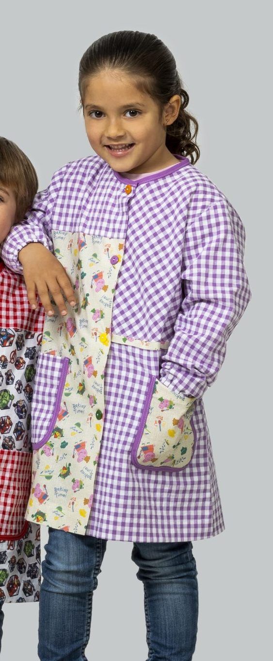 Babi infantil de manga larga con puños de goma. Cierre central con botones de diferentes colores. Tiene cinta en el cuello para colgar y dos bolsillos laterales. Divertido estampado lateral de Peppa Pig sobre fondo de cuadro lila. Tejido muy suave y duradero. Seca muy rápido y no necesita planchado.
