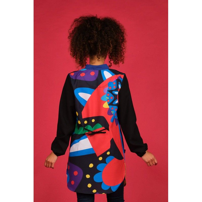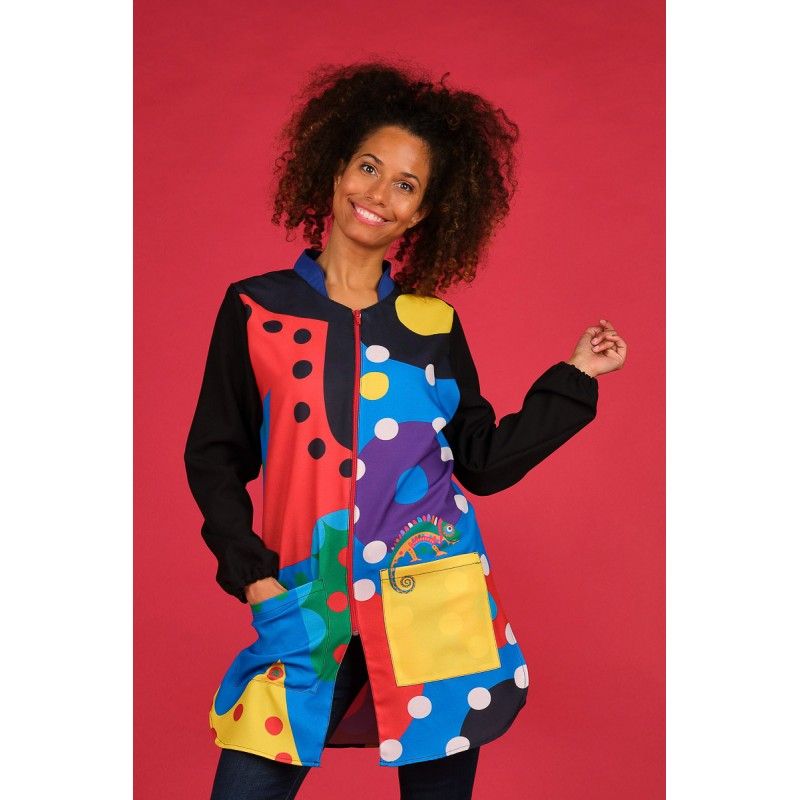 Bata de manga larga con puños de goma. Cierre central con cremallera y cuello mao. Tiene dos bolsillos y aberturas laterales que aportan mayor comodidad. Pinzas traseras con cintas para entallar la prenda. Divertido estampado de camaleón sobre fondo de color lila o negro. Tejido muy suave y transpirable. Tolerante a las salpicaduras de lejía. Seca muy rápido y no necesita planchado.