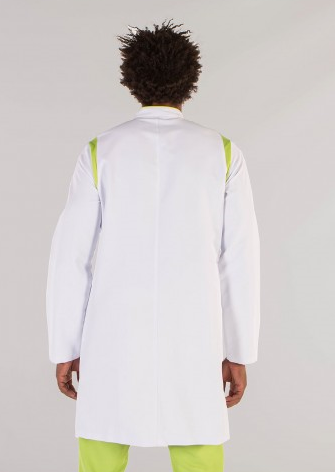 Bata de manga larga para caballero. Cierre central con corchetes ocultos. Tiene dos bolsillos inferiores. Confeccionada en tejido de microfibra, muy suave y transpirable. No decolora con la lejía y no necesita planchado. Es antibacteriano y se puede lavar a 90º. Repele los líquidos. Detalles a contraste de color verde pistacho o gris en aerosilver sobre fondo blanco.