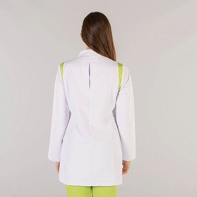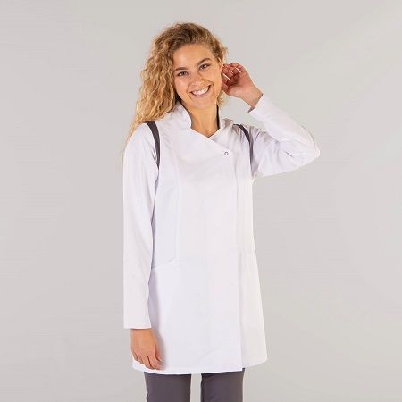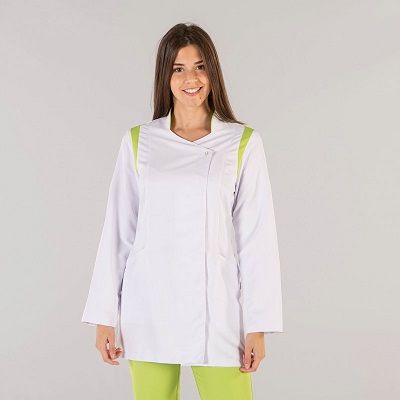 Bata semiajustada y corta para mujer. Cierre central con corchetes ocultos. Tiene dos bolsillos inferiores. Confeccionada en tejido de microfibra, muy suave y transpirable. Tolerante a las salpicaduras de lejía y no necesita planchado. Es antibacteriano y se puede lavar a 90º. Repele los líquidos. Detalles a contraste de color verde pistacho o gris en aerosilver sobre fondo blanco.