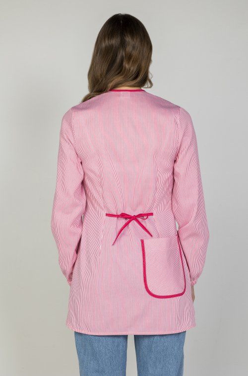 Bata de profesora colorida y alegre, con un diseño de un globo y un sol de rayitas que transmiten ilusión y energía positiva. Ideal para crear un ambiente cercano, motivador y lleno de creatividad en el aula. 67%PL – 33%CO – 150 gr/m