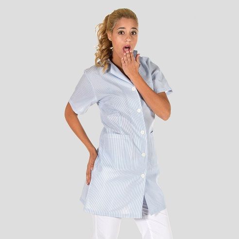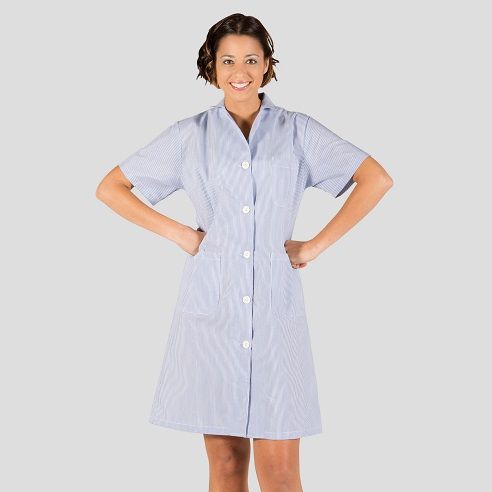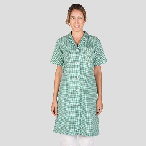 Bata de servicios para mujer. De manga corta. Confeccionada en tejido vichy, que proporciona a la prenda suavidad, frescura y gran resistencia a los roces. No se alteran los colores tras los lavados y es de secado rápido.