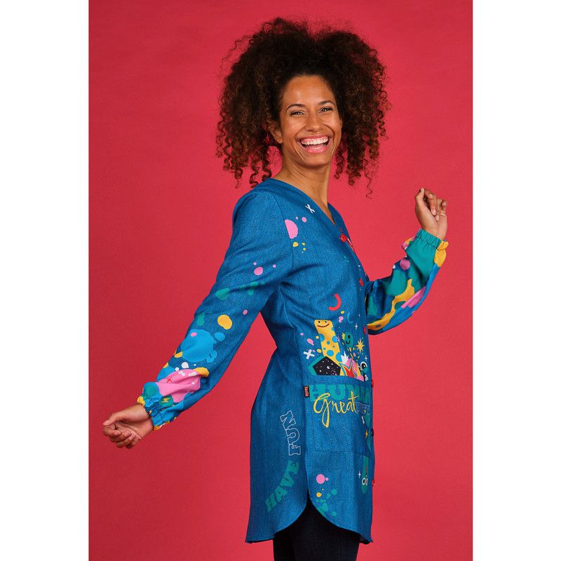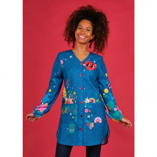 Bata de maga larga con puños de goma. Cierre central con botones y cuello en forma de pico. Tiene dos bolsillos y aberturas laterales que aportan mayor comodidad. Pinzas traseras con cintas para entallar la prenda. Fondo de color azul tejano con estampado frontal y también en mangas y parte trasera. Tejido muy suave y transpirable. Tolerante a las salpicaduras de lejía. Seca muy rápido y no necesita planchado.