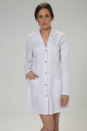 Bata de señora con corchetes. De manga larga y entallada. Incluye 2 bolsillos laterales y 1 en el pecho. Cuello con solapas y cinturón entre pinzas en la espalda.