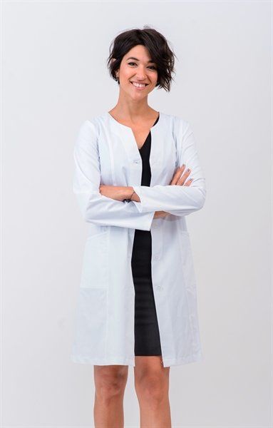 Bata de mujer con cuello fantasía. Cierre central con botones. Tiene dos bolsillos laterales. Tejido elástico, muy suave y transpirable. Resistente y duradero. Disponible en color Blanco.