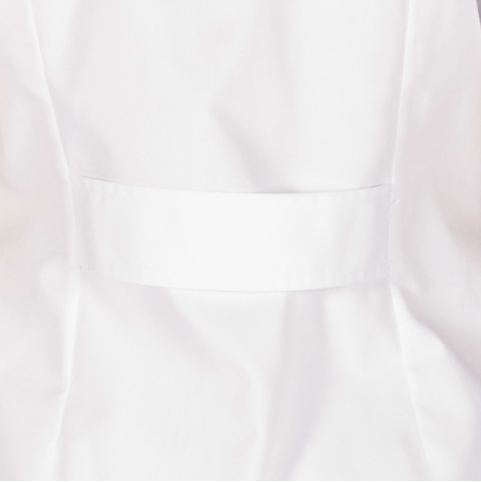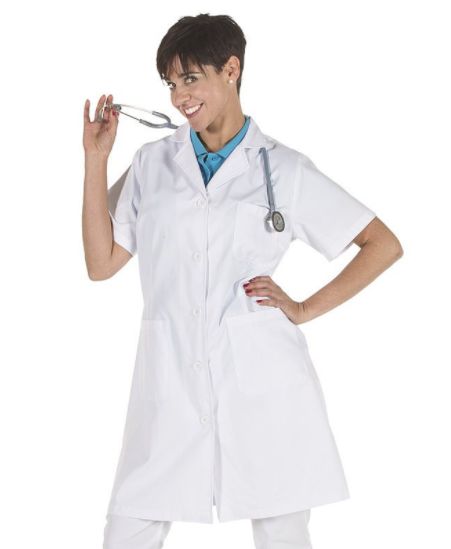 Bata entallada de manga corta. Diseño semi ajustado. Cierre central con botones. Tiene dos bolsillos inferiores laterales y uno superior, todos ellos de plastón. Cinturón en la espalda. Tejido fuerte y duradero.