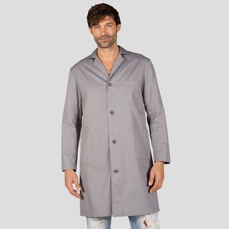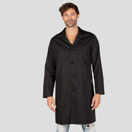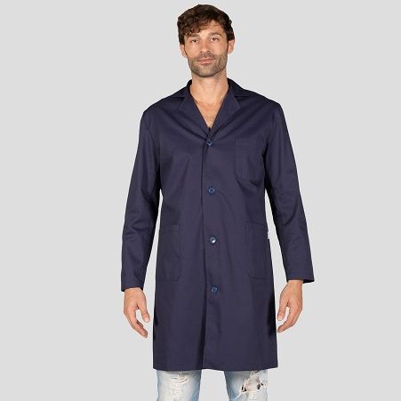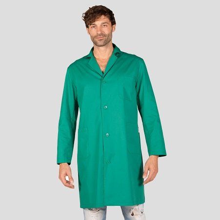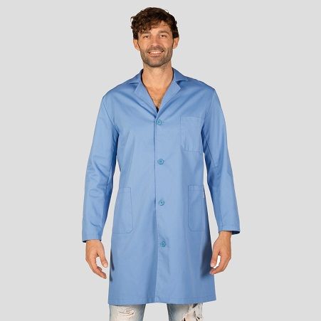 Bata unisex de manga larga con cuello camisero. Cierre central con botones. Tiene dos bolsillos inferiores y uno superior. Cinturón en la espalda. Tejido suave y resistente.