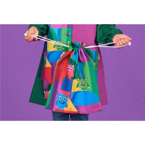 Bolsa rectangular con cierre superior con cordón. Divertido estampado de monstruos en la parte delantera sobre fondo verde pistacho.