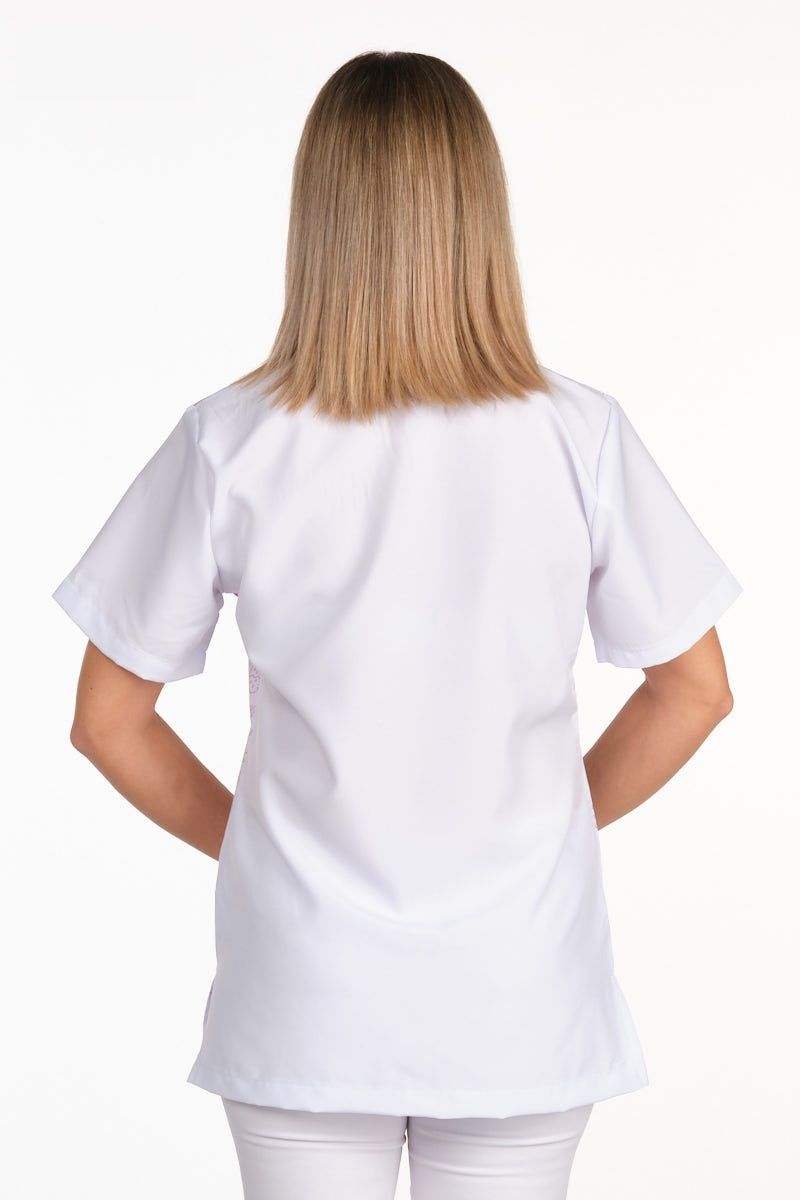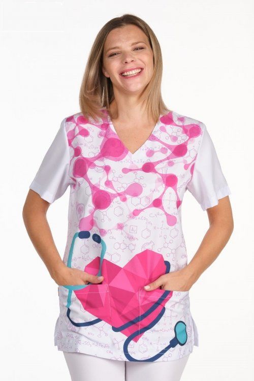 Casaca unisex de manga corta y cuello de pico. Incluye aberturas laterales para mayor facilidad de movimiento. Tiene un bolsillo inferior en el lateral derecho. Fondo blanco con estampado de fórmulas químicas y un corazón rosa con un fonendo. Tejido muy suave y transpitable. Tolerante a las salpicaduras de lejía. Seca muy rápido y no necesita planchado.