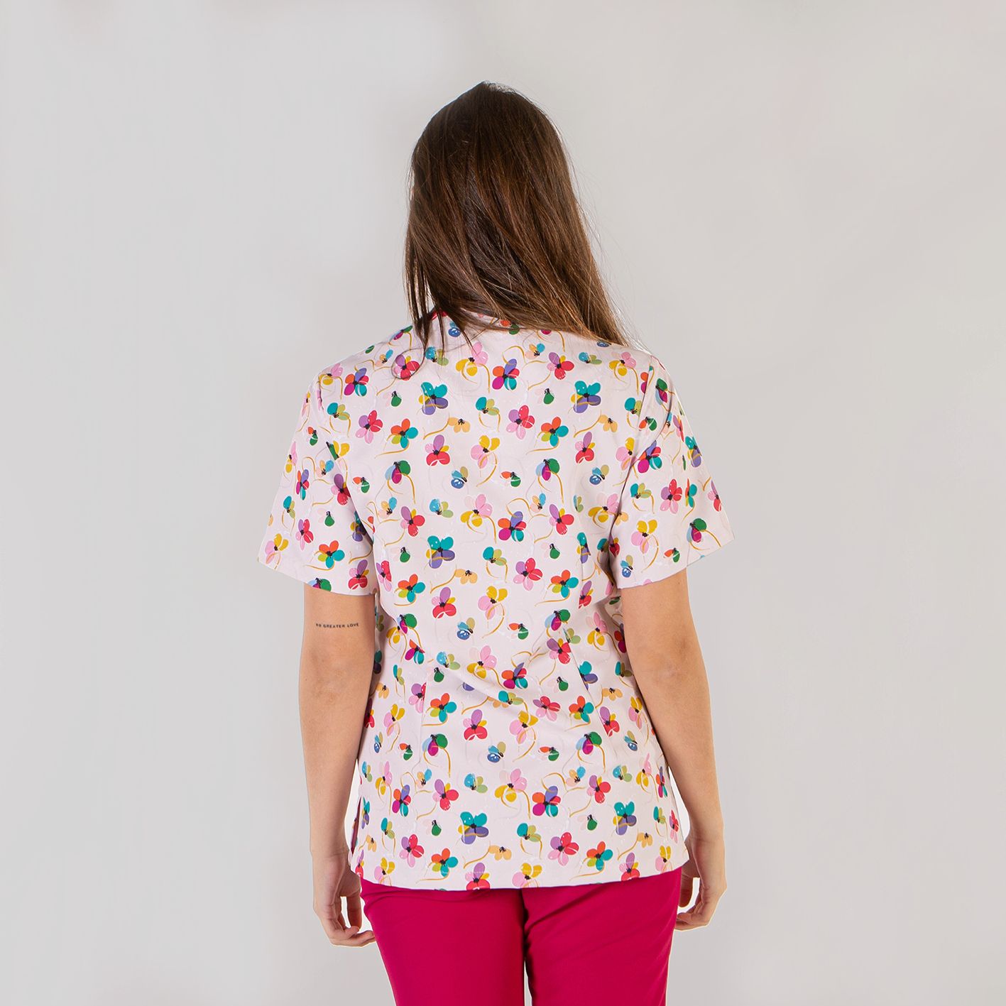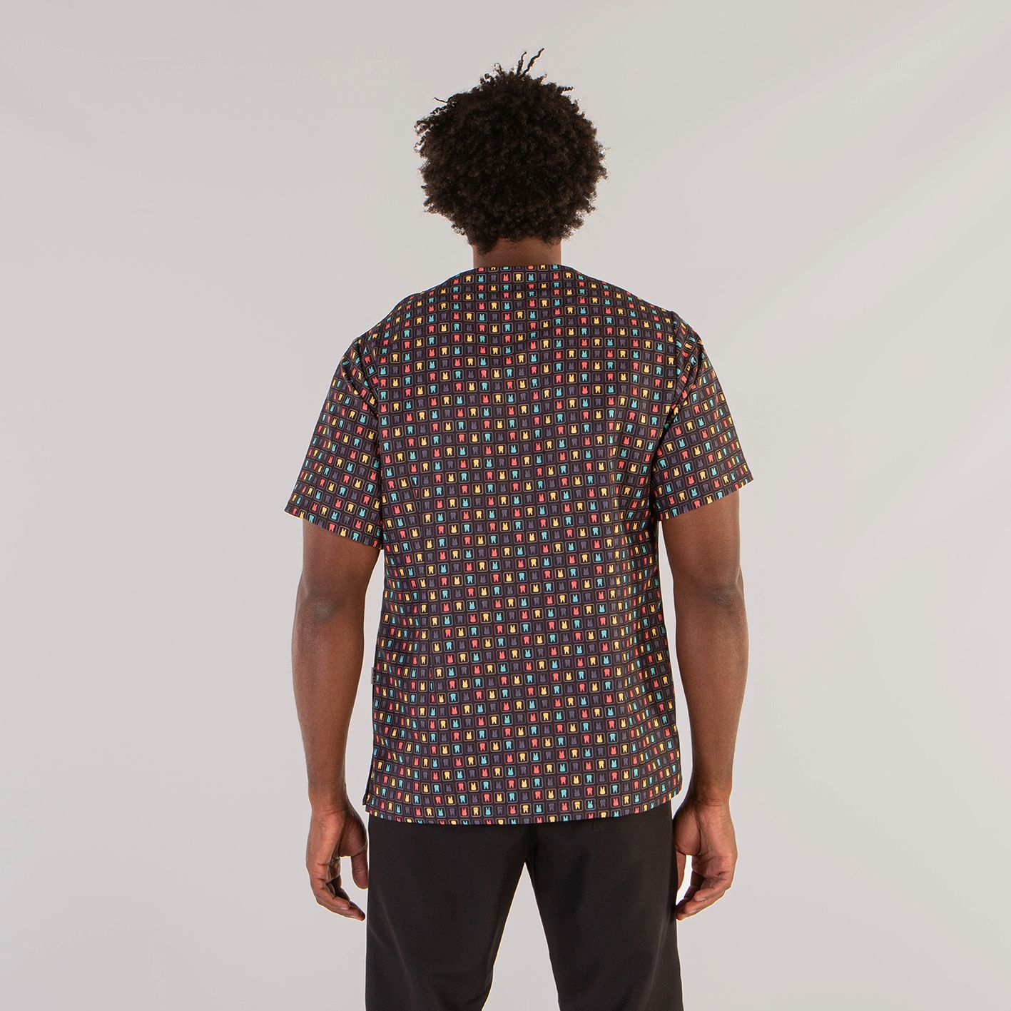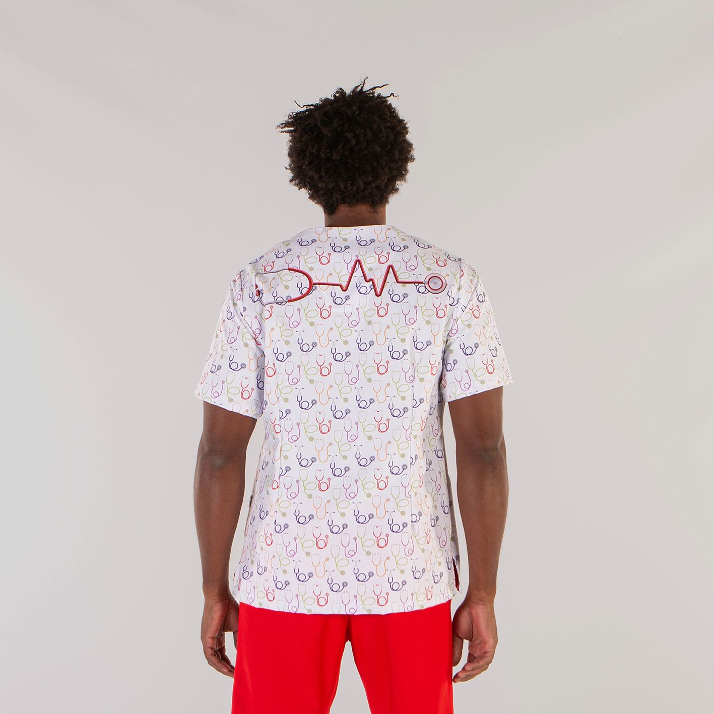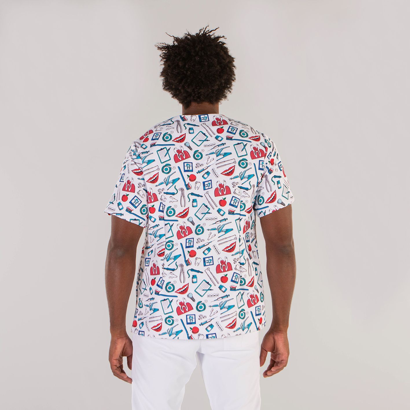Casaca unisex de manga corta con divertidos estampados infantiles, ideal para pediatría, veterinaria, etc... Con cuello de pico y pinzas en la espalda. Incluye aberturas laterales y 2 bolsillos (1 superior y 1 inferior). Confeccionada en tejido antibacteriano de Microfibra, lavable hasta 90º, no decolora con la lejía y no necesita planchado. Muy suave y transpirable. Seca muy rápido.