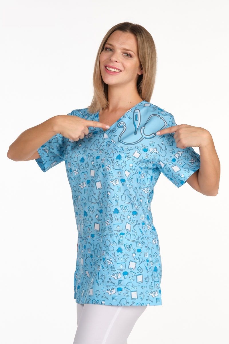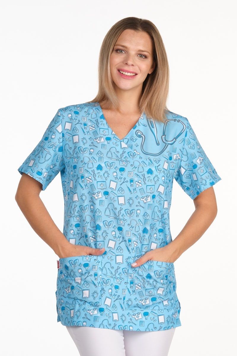 Casaca unisex de manga corta y cuello de pico. Incluye aberturas laterales para mayor facilidad de movimiento. Tiene dos bolsillos inferiores en los laterales. Fondo azul celeste con estampado de diferentes útiles sanitarios. Tejido muy suave y transpitable. Tolerante a las salpicaduras de lejía. Seca muy rápido y no necesita planchado.