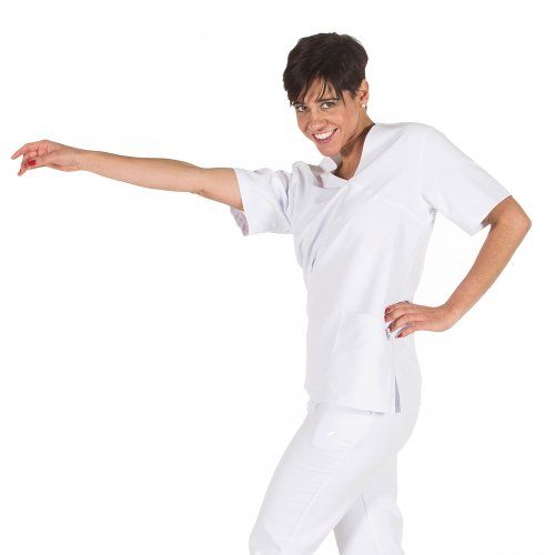 Casaca unisex de cuello de pico. Tiene dos bolsillos inferiores. Tejido antibacteriano y muy transpirable. Lavable hasta 90º. Tolerante a las salpicaduras de lejía, repelente de líquidos y cabellos. No necesita planchado. Disponible en una gran variedad de colores.