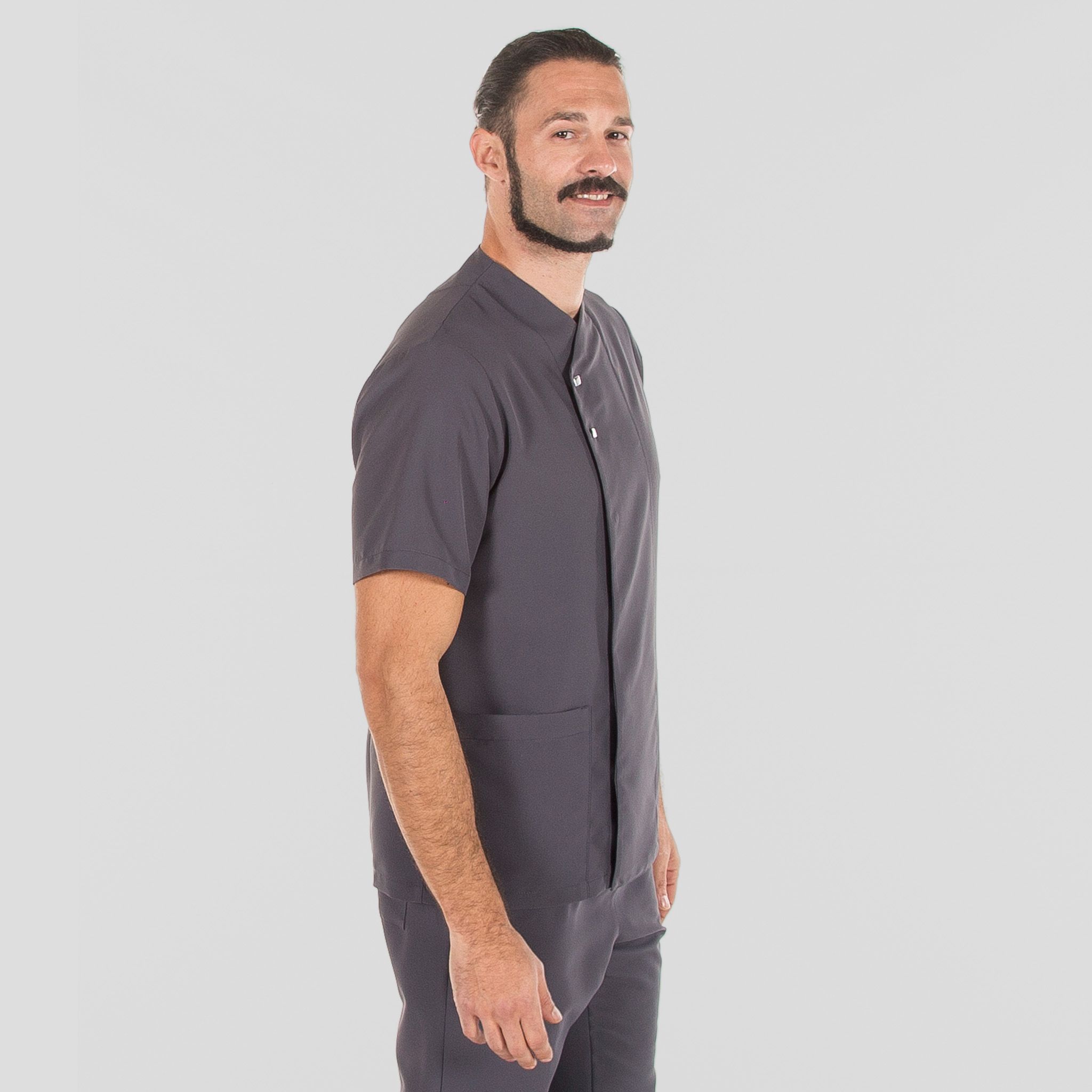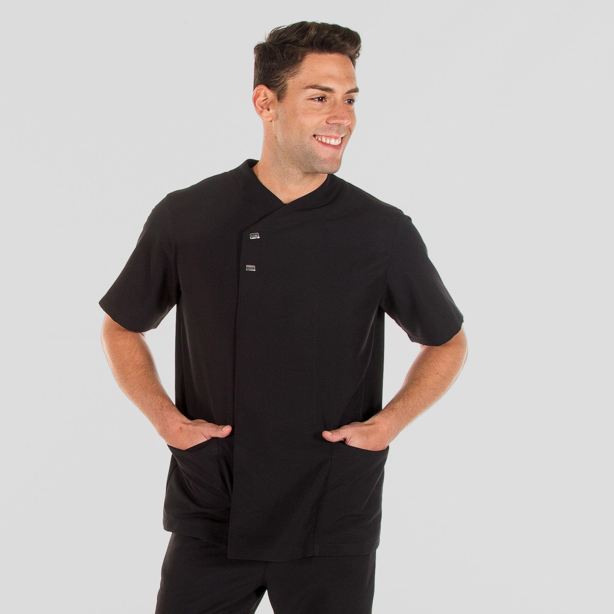 Casaca unisex de manga corta. Cierre lateral con corchete oculto. Detalle plateado en el cuello. Incluye 2 bolsillos inferiores. Semiajustada con pinzas en la espalda que realzan la figura. Tejido antibacteriano, lavable hasta 90º y tolerante a las salpicaduras de lejía. Repelente de líquidos y cabello. Muy suave y transpirable, no necesita planchado. Seca muy rápido