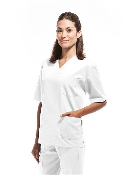 Casaca Unisex cerrada de manga corta con cuello de pico. Incluye 2 bolsillos inferiores y 1 superior.