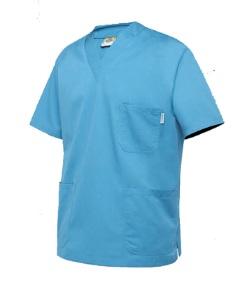 Casaca unisex de cuello de pico y manga corta montada. Tiene dos bolsillos inferiores y uno superior. Disponible en color Azul Celeste o Verde Quirófano.