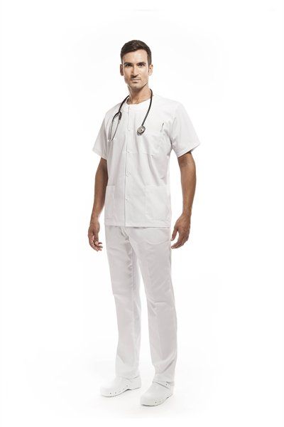 Casaca Unisex de manga corta con cuello redondo y cierre central con botones. Incluye 2 bolsillos inferiores y 1 superior.