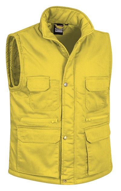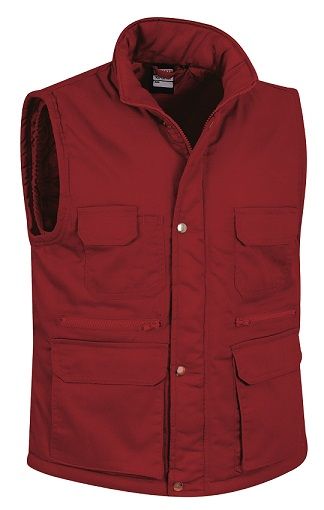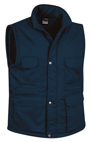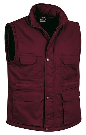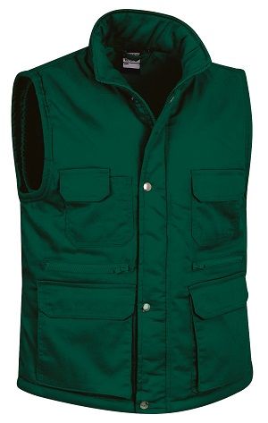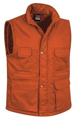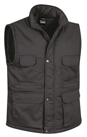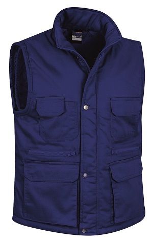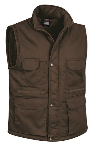 Chaleco con relleno acolchado y forro interior. Cierre central con cremallera ocultaa con tapeta y corchetes. Con cuello alto. Tiene ocho bolsillos exteriores, incluyendo dos compartimentos para herramientas y un bolsillo para el teléfono móvil. También dispone de un bolsillo interior. Cortavientos con elástico en las bocamangas y reguladores con corchetes en los laterales para mejor ajuste. Espalda más larga con faldón en la parte inferior.