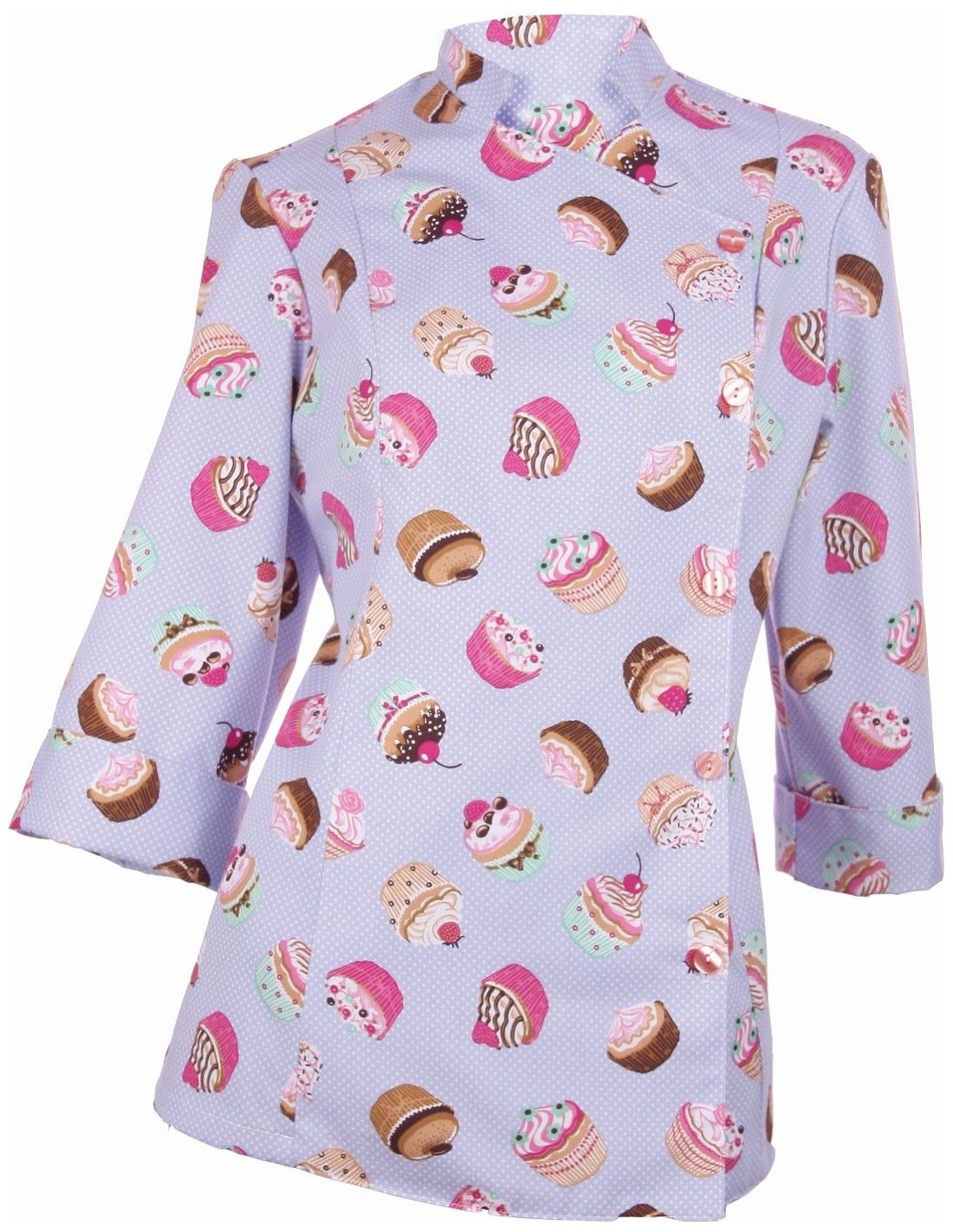 Chaqueta semiajustada de mujer para hostelería. De manga larga vuelta. Cierre lateral con botones. Estampado de cupcakes. Esta prenda ofrece resistencia a los roces y máximo confort al trabajador. Algodón 100%. Alta transpirabilidad y lavable a 30º