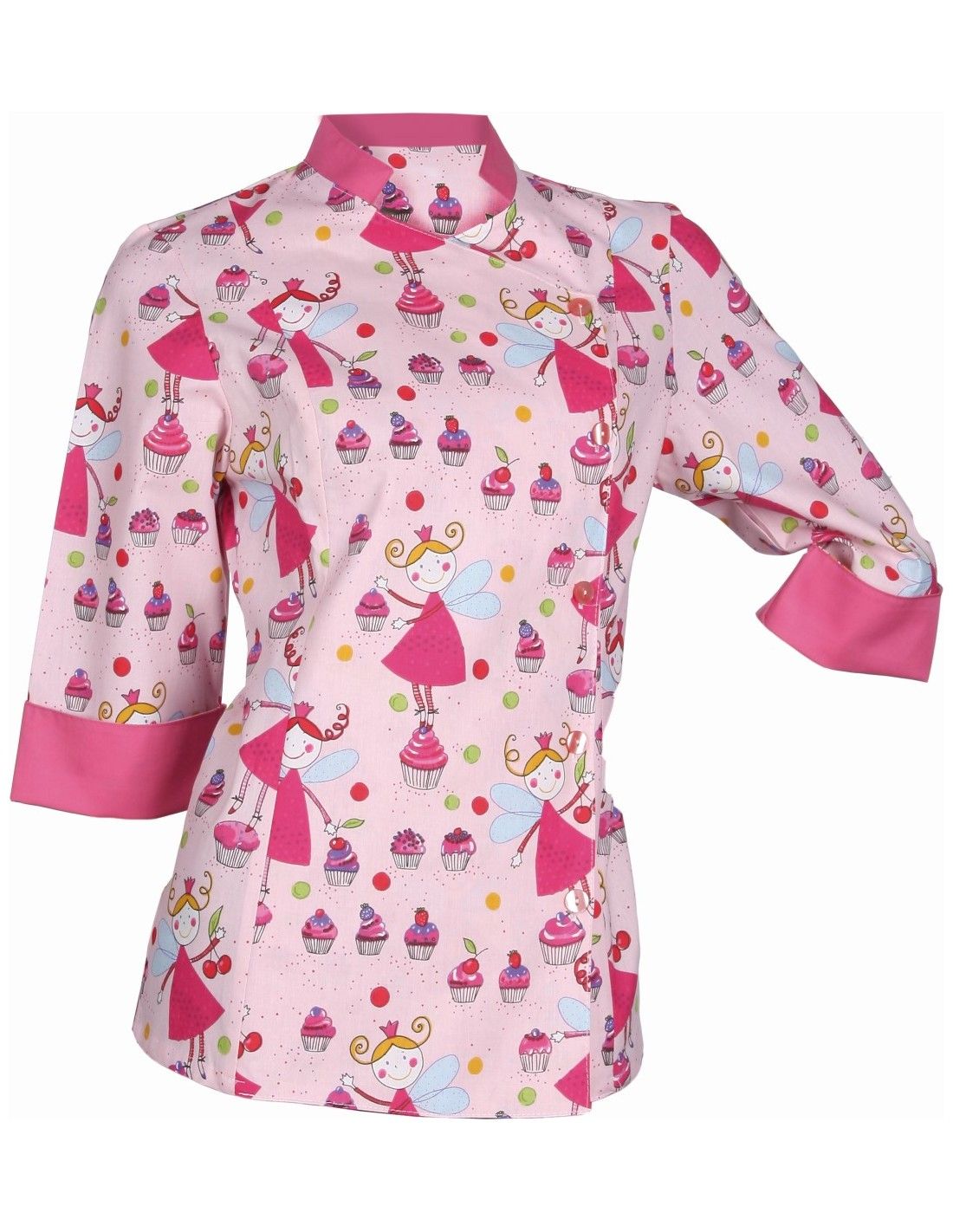 Chaqueta semiajustada de mujer para hostelería. De manga larga vuelta. Cierre lateral con botones. Estampado de hadas. Esta prenda ofrece resistencia a los roces y máximo confort al trabajador. Algodón 100%. Alta transpirabilidad y lavable a 30º