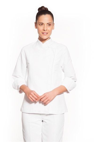 Chaqueta de cocina para mujer. Confeccionada en tejido de microfibra, muy suave y transpirable. No decolora con la lejía y no necesita planchado. Tejido nido de abeja en espalda que proporciona mayor transpirabilidad. Cierre lateral con corchetes ocultos. Incluye 1 bolsillo en la manga izquierda. Disponible en color Blanco, Negro o Verde Kaki.