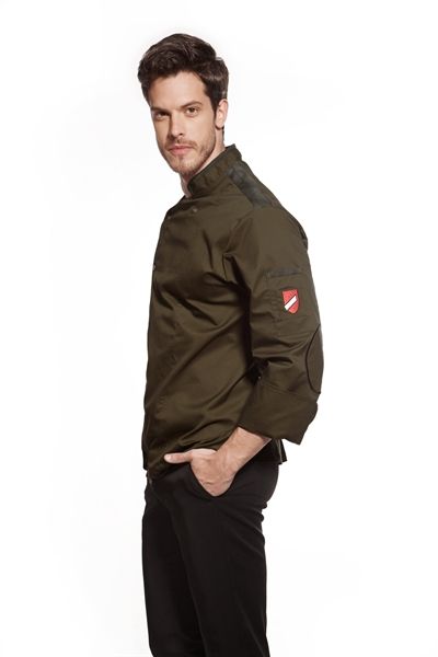 Chaqueta de manga larga con puño vuelto. Estilo militar con coderas y detalle bordado rojo. Prenda elástica que aporta mayor confort al trabajador.