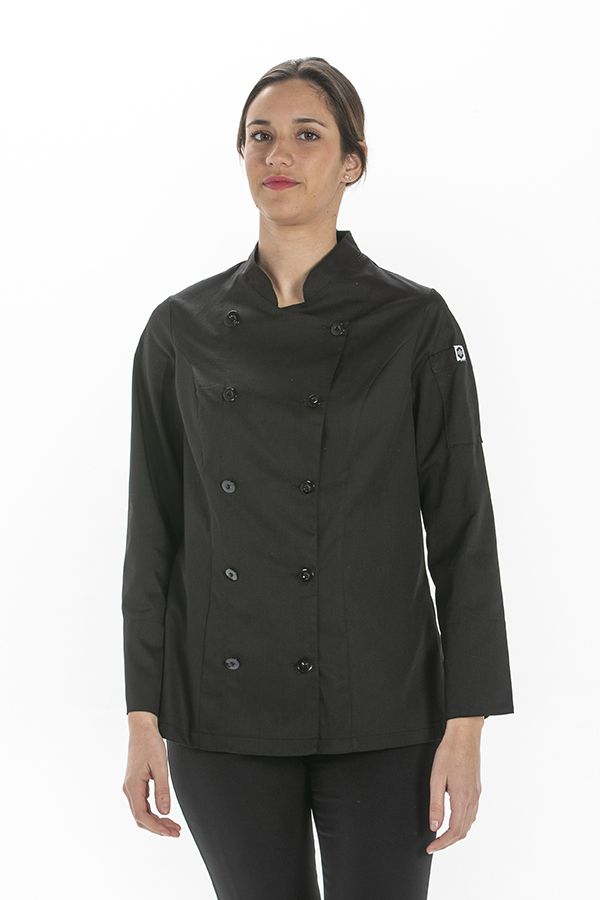Chaqueta para hostelería de manga larga con puños vueltos. Entallada con cierre cruzado de doble botonadura. Cuello mao. Tiene un bolsillo lateral en la manga, ideal para guardar el bolígrafo.