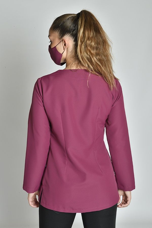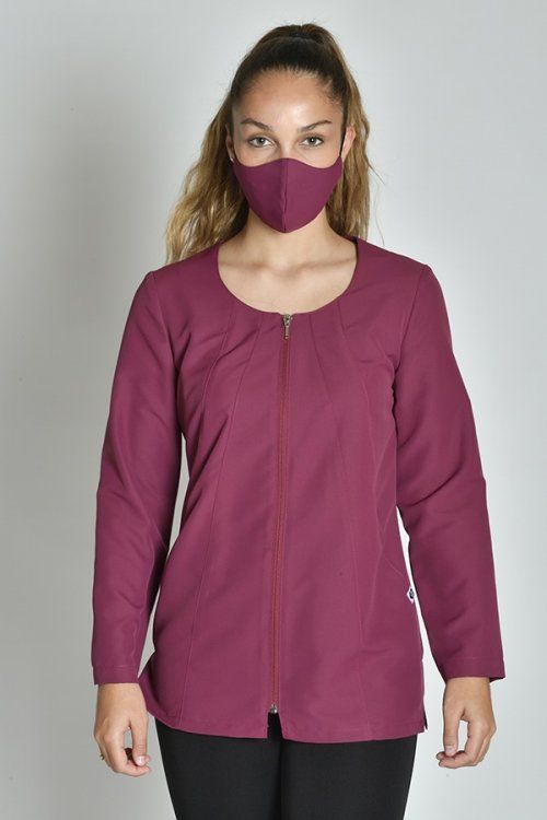 Chaqueta entallada para mujer de manga larga. Cuello redondo y cierre con cremallera invertida que evita el deterioro por rozaduras. Confeccionada en tejido antibacteriano de microfibra, lavable a 90º, no necesita planchado y no decolora con la lejía. Incluye bolsillos invisibles en las líneas de costura y aberturas laterales para mayor comodidad.