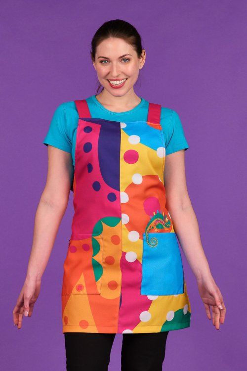 Estola de tirantes con escote cuadrado. Talla única ajustable con cintas que se cruzan y se atan en la espalda. Fondo morado con estampado delantero de camaleón. Tiene dos amplios bolsillos en los laterales. Tejido muy suave y transpirable. Tolerante a las salpicaduras de lejía. Seca muy rápido y no necesita planchado.