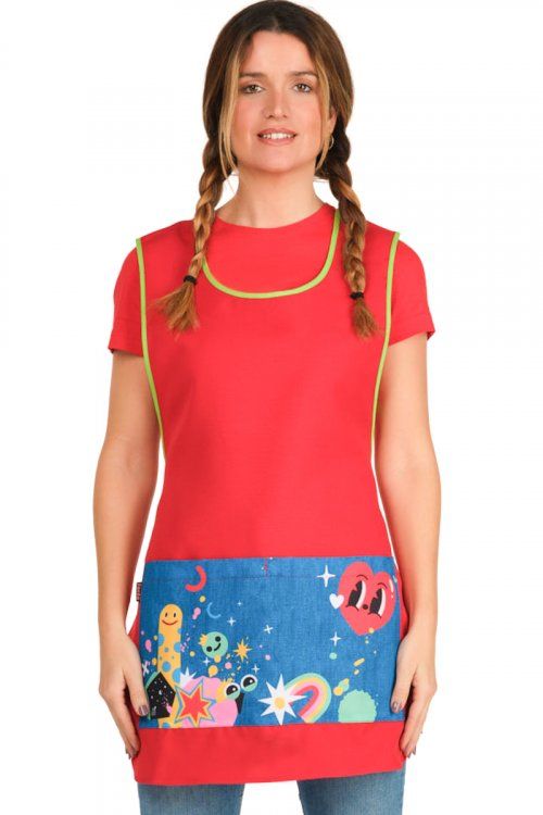 Estola roja con colorido bolsillo estampado. Talla única, ajustable con cintas que se cruzan por la espalda y se anudan en la cintura. Incluye 1 bolsillo central y corte con pinzas delanteras.