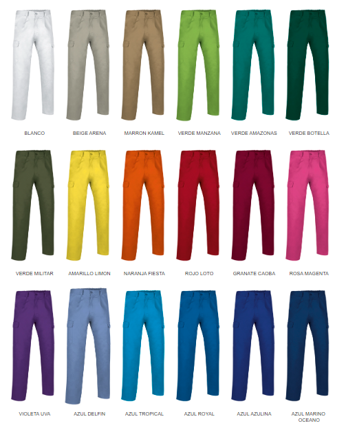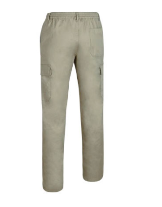 Pantalón unisex con multibolsillos. Cierre central con cremallera y botón. Cintura con elástico interior en la zona trasera para un mejor ajuste. Tiene dos bolsillos oblicuos en la cadera y dos bolsillos grandes de parche con tapa y cierre de velcro en los laterales de ambas perneras. Bolsillo trasero en el lado derecho. Confeccionado en tejido de sarga, muy resistente y duradera. Disponible un amplio surtido de colores.