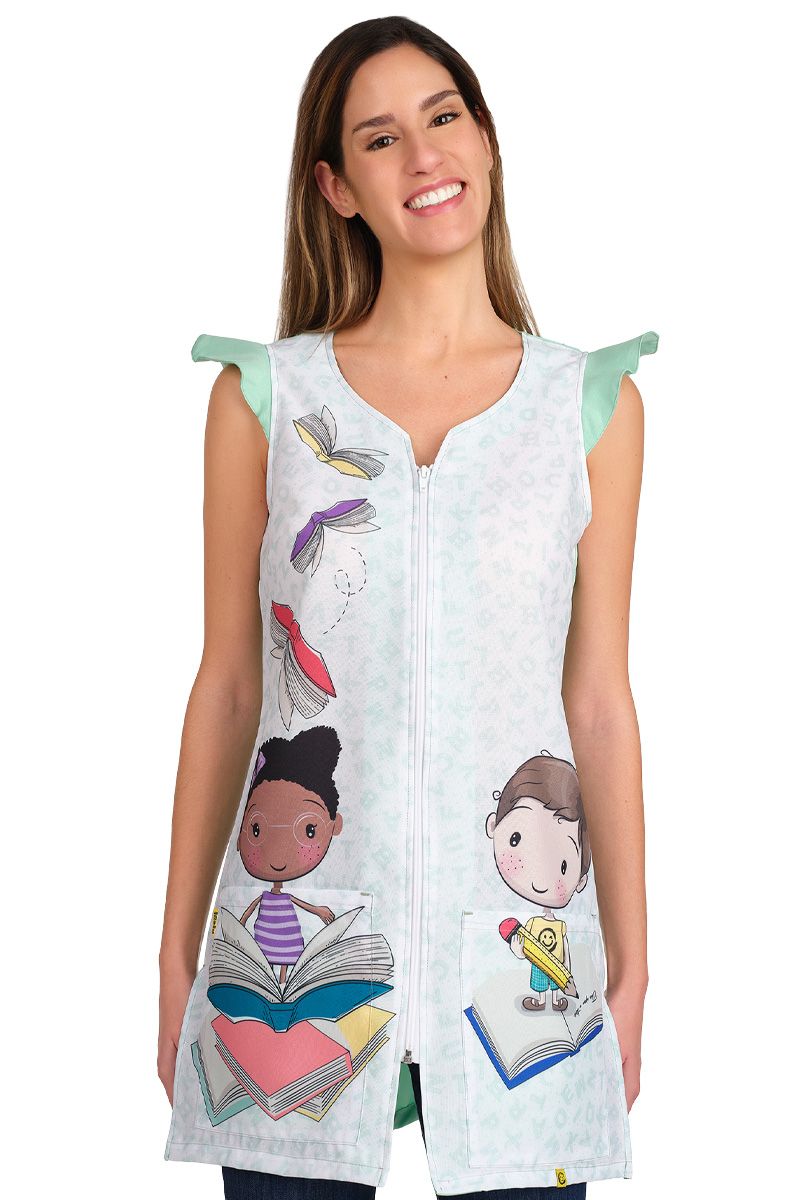 Suave fondo cubierto de letras y encantadoras ilustraciones de niños leyendo, esta bata está diseñada para estimular la curiosidad y el hábito de la lectura entre tus alumnos de una manera visual y divertida.