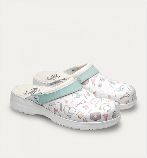 Zueco unisex abierto. Con divertido estampado sanitario. Compuesto de material Eco T (material reciclado y certificado). Antideslizante y con suela de Eva Comfortlight. Cada zapato pesa 150 grs. Su plantilla de piel-EVA es extraíble y recambiable. Con correa abatible. Su horma es ergonómica y anatómica. Disponible con el fondo blanco.